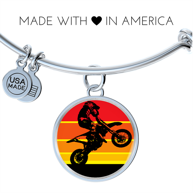 MX Sunset bracelet for dirt bike riders and motocross racers features a colorful graphic sunset and the silhouette of a jumping moto-x rider